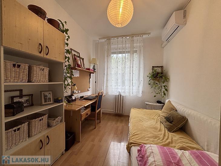 Az ingatlan praktikus elosztású, szobái külön nyílnak, a konyha pedig kifejezetten nagy és tágas, így étkezőként is jól használható, családok számára is kényelmes megoldást kínál. A nyílászárók műanyagok, a burkolatok jó állapotúak, a szobákban parketta található. A délkeleti fekvésnek köszönhetően a lakás világos, napfényes.