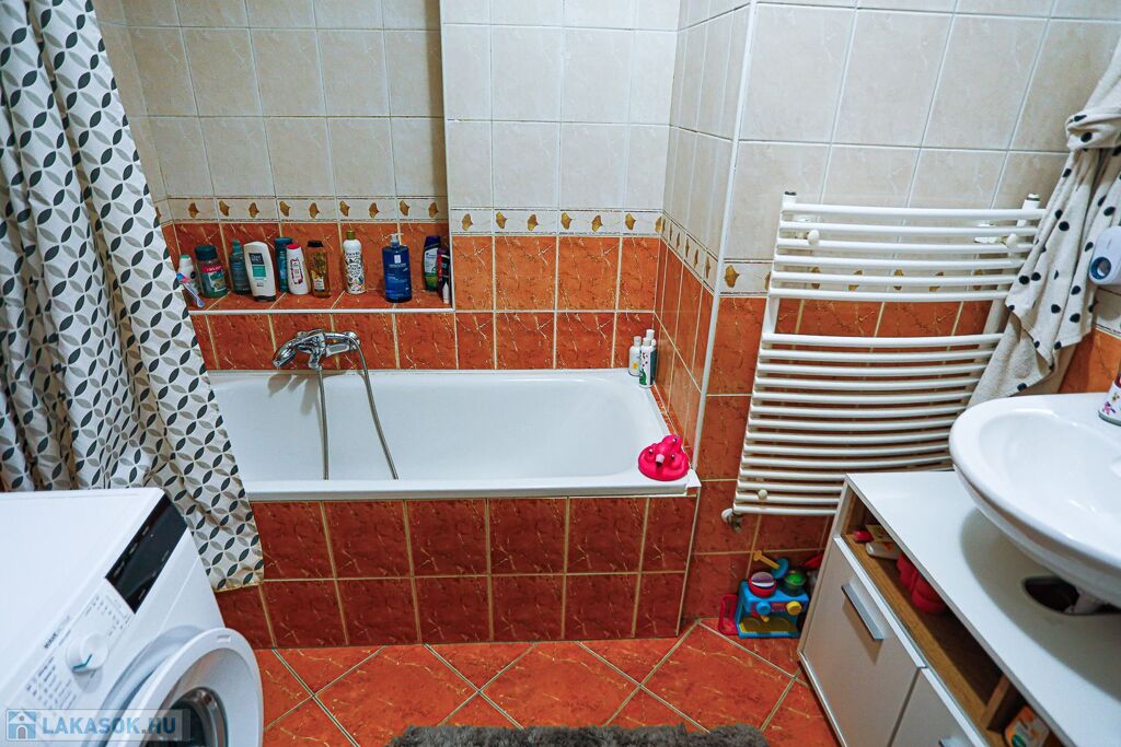 A FÜRDŐ ÉS A WC KÜLÖN helyezkedik el. Tágas előtere NAGYMÉRETŰ SZERKÉNYEKKEL ELLÁTOTT, amely ideális pakolófelületet biztosít – mindezek a vételár részét képezik.