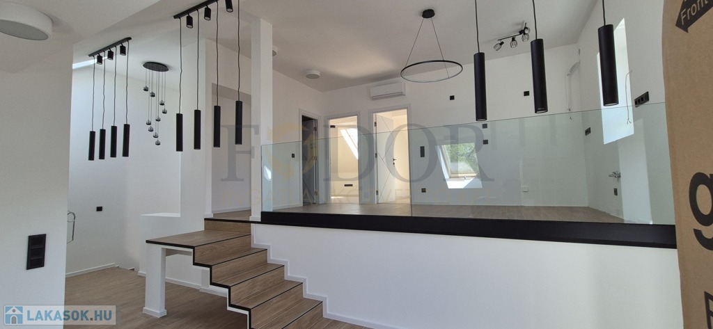 • valamint egy nagyobb alapterületű,112 m²-es nettó alapterülettel rendelkező, belső kétszintes, nappali + 2 hálószobás, közel 200 m²-es privát kerttel rendelkező otthon. Ára: 133 Millió Ft.