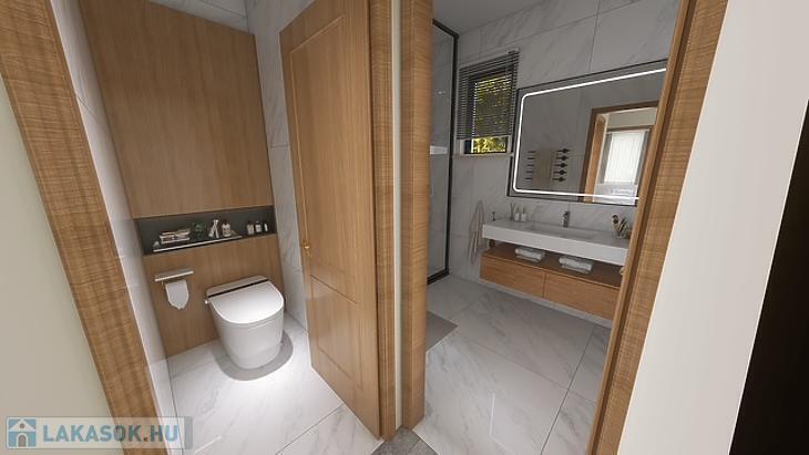 Hőszivattyús fűtés-fűtés rendszer (mennyezeti) és padlófűtés biztosítja a meleget. Az ár tartalmazza a burkolatokat, szerelvényeket és szanitereket is.