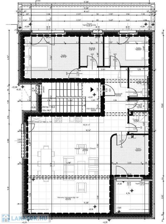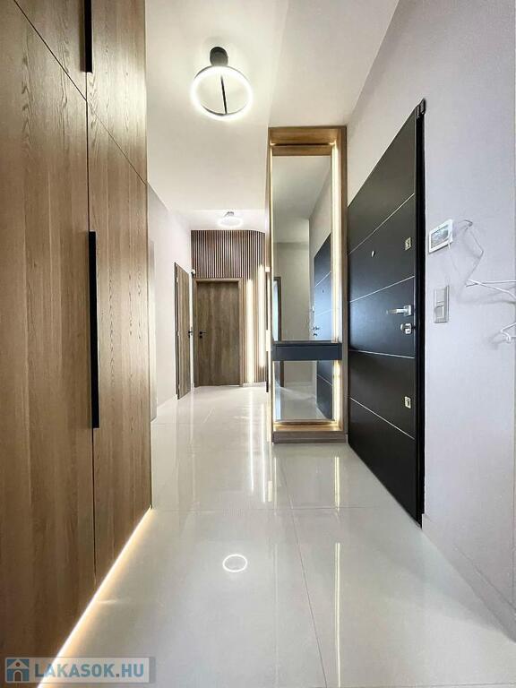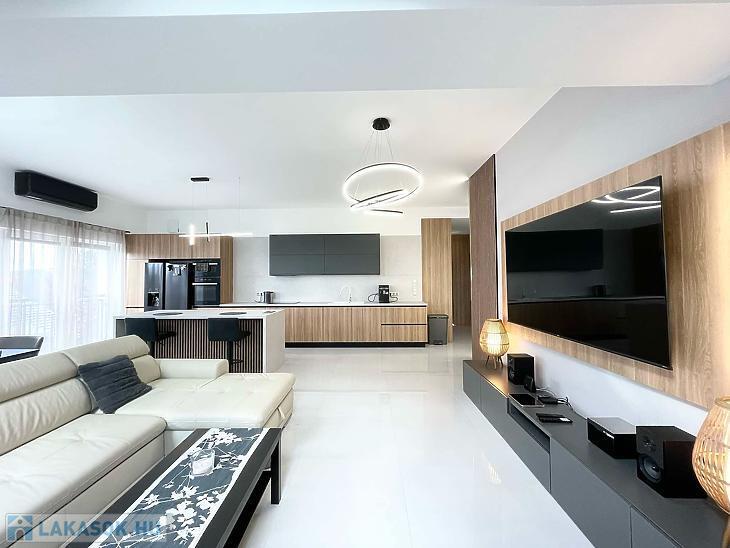 A lakásban egy 44 m2-es amerikai konyhás, étkezős nappali, 3 szoba, 2 fürdőszoba, előtér, közlekedő, mellékhelyiség és 2 terasz található (7 m2+ 23 m2). Gyönyörű, egyedi, minőségi burkolatok lettek beszerelve.