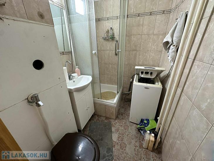 Fürdőszoba zuhanyzós és WC-vel felszerelt, használható, igény szerint könnyen felújítható.