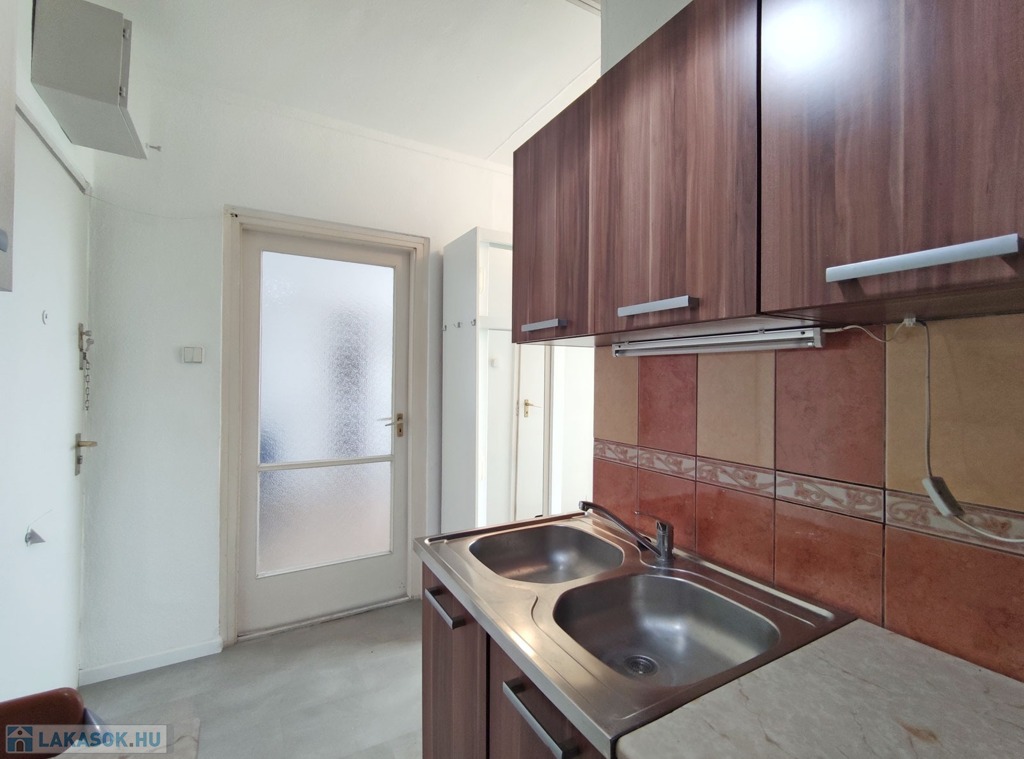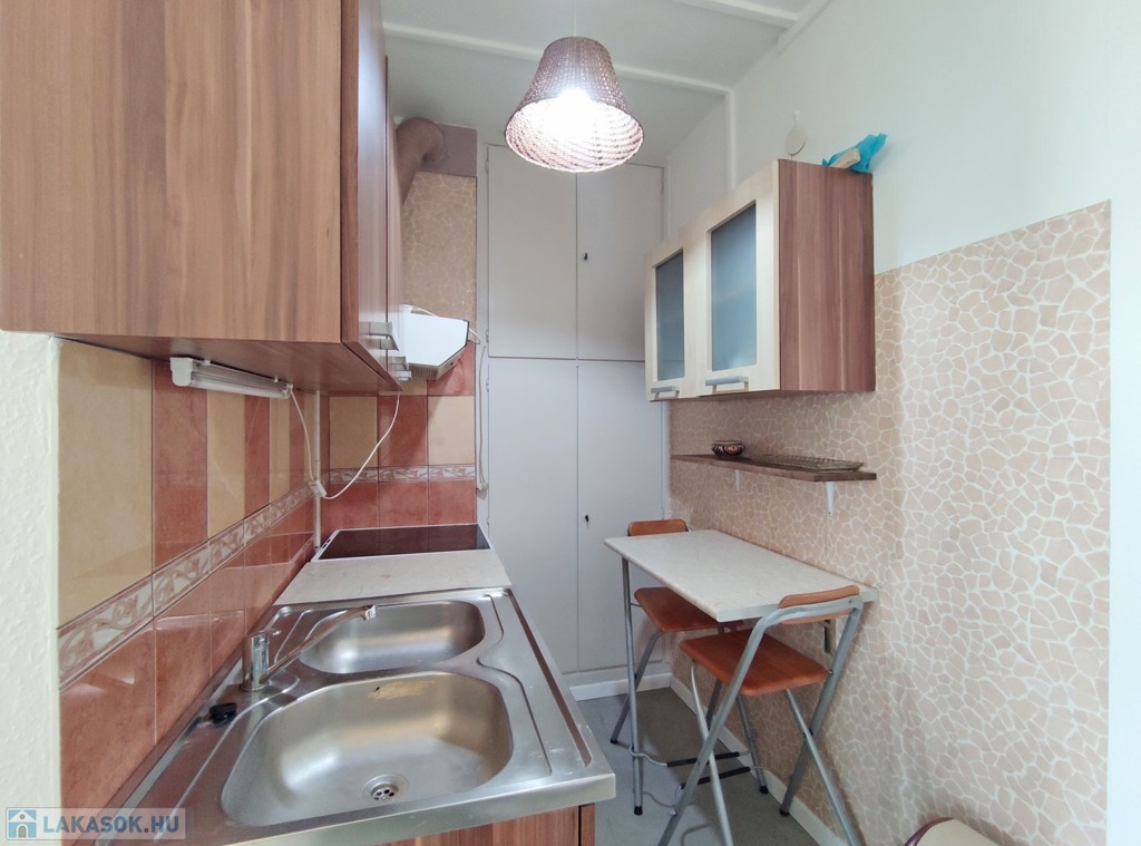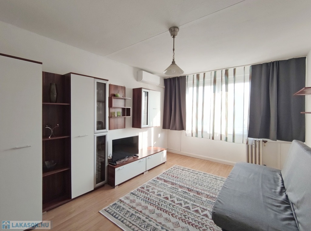 Belépve a közlekedőből balra nyílik a 18,3 mn-es nappali , amit laminált parkettával burkoltak, Dél-Nyugati fekvésének köszönhetően napfényes, nyáron a hűtéséről klíma gondoskodik. Szemben nyílik az ablakos, szintén napfényes laminált parkettás félszoba. Jobbra a közlekedővel egy légtérben található a gépesített 3,85 nm-es konyha, bútorzata újszerű, amely a vételár részét képezi, 6 éve eset át egy tejleskörű felújításon.