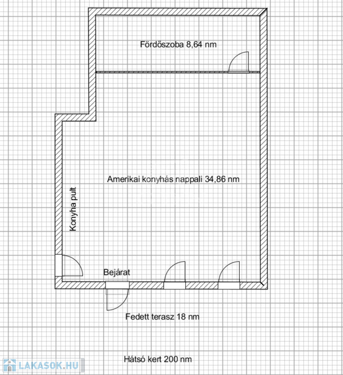Alapterülete 44 nm, jelenleg 1 nagy szobás, amerikai konyhás elosztású, de könnyedén 1,5-2 szobássá alakítható több féle alaprajzi lehetőséggel.