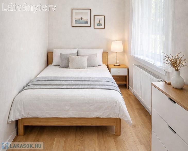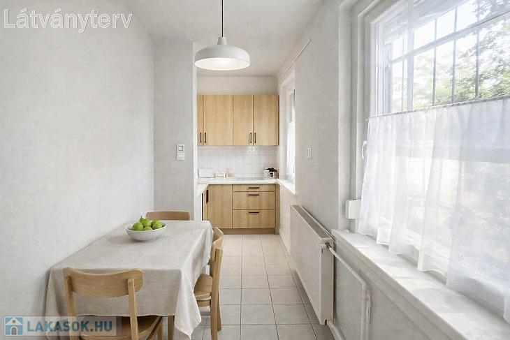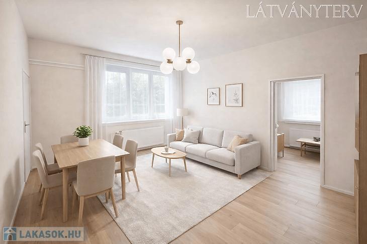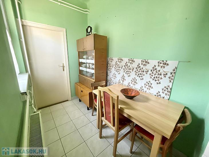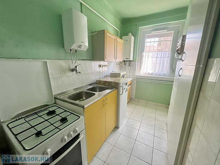 Előszoba, L alakú étkezős konyha, nappali, hálószoba, kádas fürdőszoba, kamra áll rendelkezésre. A nyílászárók 5 éve műanyag, hőszigetelt ablakokra és biztonsági ajtóra lettek cserélve. Az ablakok redőnnyel és ráccsal ellátva, egy része szúnyoghálós is. A villanyvezetékeket rézre váltották. A fűtés gázcirkóval biztosított lapradiátorokon keresztül. Tartozik a lakáshoz egy 4 nm-es zárható tároló. A szobák ablakai a parkosított udvarra nyílnak.