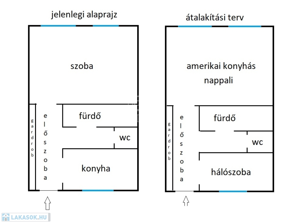 A konyha áthelyezésével egy amerikai konyhás nappali és egy hálószoba könnyedén kialakítható!