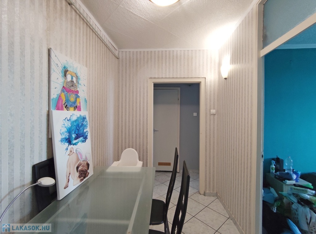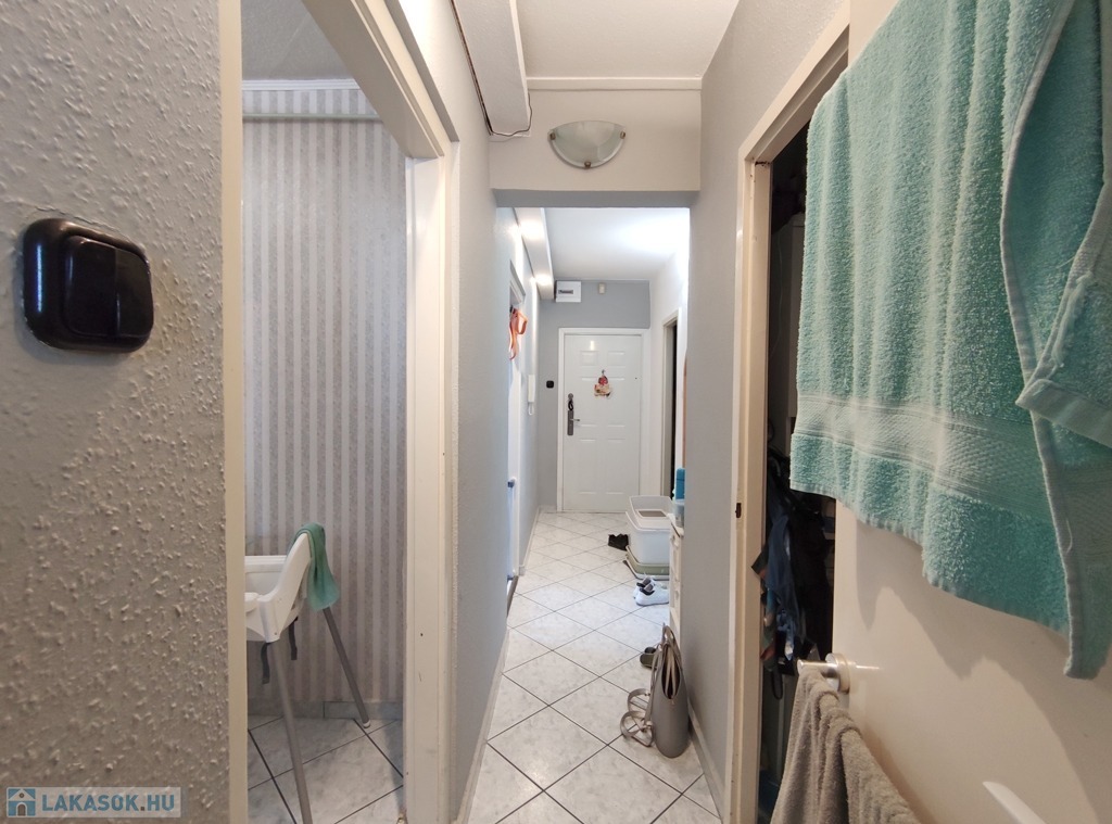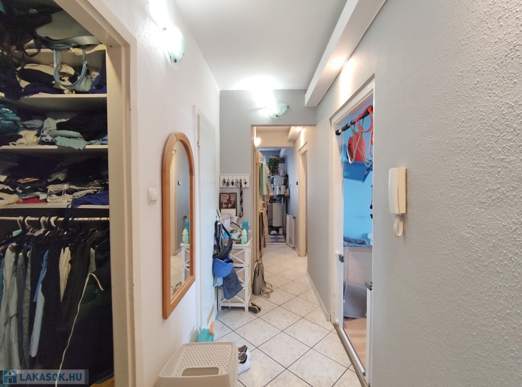 A több ponton záródó biztonsági bejárati ajtón keresztül részben felújított és karbantartott állapotú, a szobák elrendezését tekintve remek elosztású, hallos lakásba érkezünk. A bejárati ajtón belépve az előszobában közvetlenül jobb kéz felől a jó állapotú minőségi laminált parkettás, tágas, világos, panorámás, 19 nm-es, műanyag ablakos, redőnnyel szerelt nappaliba jutunk. A külön nyíló nappaliból és a közlekedőből nyíló kisebbik, minőségi laminált padlós 11 nm-es szobából is a 14 nm-es, szintén minőségi laminált parkettás, műanyag ablakos hálószobába eljuthatunk. A bejárathoz visszamenve a közlekedőben balra haladva a 2,34 nm-es, járólapos és polcos gardrób, mellette pedig a 0,8 nm-es, járólapos, polcozott kamra kapott helyet. Ezután a 2,9 nm-es kádas fürdőszobát, mellette pedig a 0,8 nm-es mellékhelyiséget találjuk. A közlekedő végében járólapos, nagyméretű műanyag ablakos, redőnyös, tágas és nagyon világos 7,6 nm-es, konyhabútorral szerelt és gépesített konyhába juthatunk el.