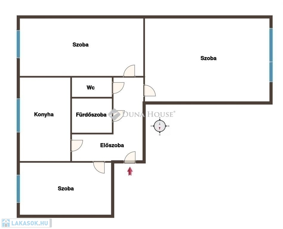 Az ingatlanban egy tágas nappaliszoba, két hálószoba (mind külön bejáratúak), egy ablakos konyha, egy fürdőszoba, egy wc, és a helyiségeket összekötő előszoba - közlekedő helyiségek kaptak helyet. A lakás kifejezetten parktikus elrendezésű, különnyíló helyiségei okán családosoknak is ideális.