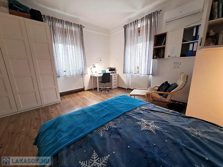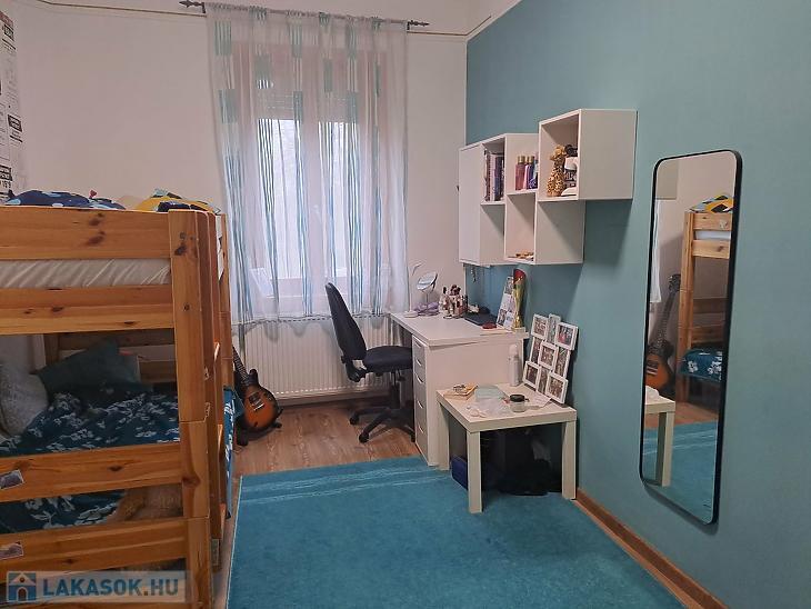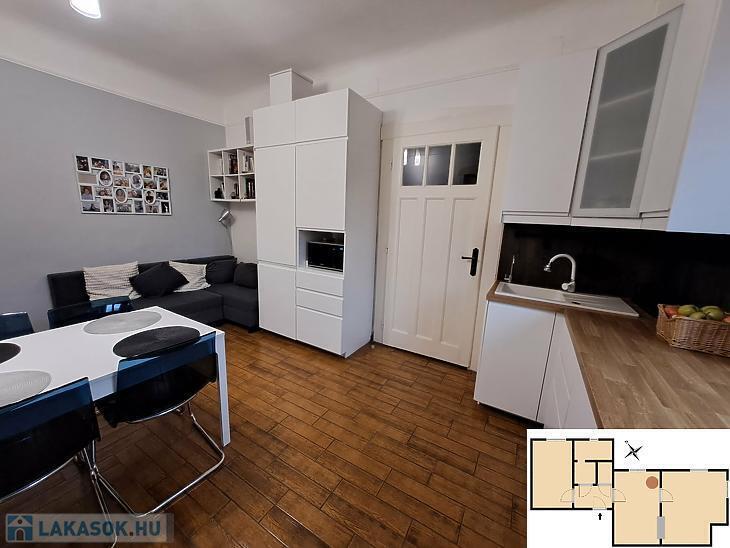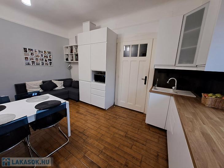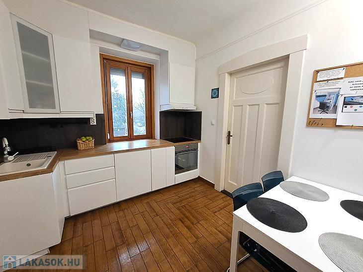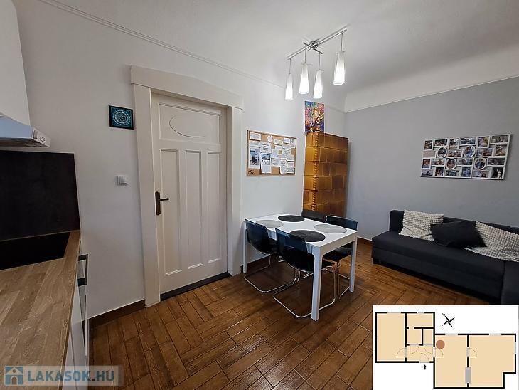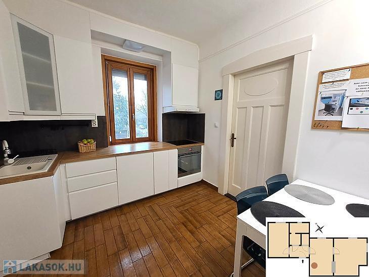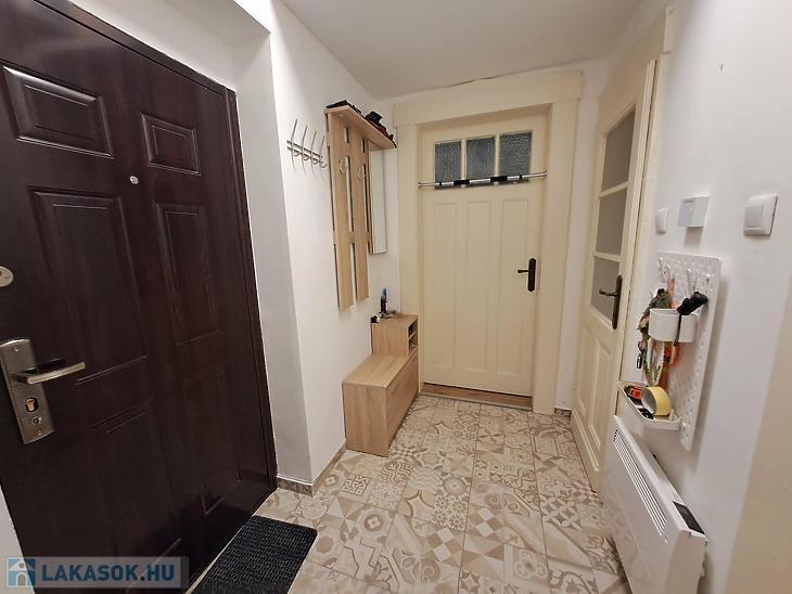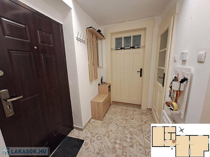 A lakásba belépve elsőként az előszobába térünk, ahonnan nyílik egy hálószoba, a kádas fürdő, külön nyíló wc és az étkezős konyha, ahonnan tovább juthatunk a nagyobb hálószobába. A lakás néhány éve részleges felújításon esett át. Új burkolat a szobákban és az előszobában, többségében ki lettek cserélve a szaniterek, új IKEA konyhabútor, konyhai gépesítés és egy konyhai víztisztító lett beépítve, ami a csapvíznél és az ásványvíznél tisztább, egészségesebb ivóvízről gondoskodik. Az elektromos hálózat felújítása már korábban megtörtént, a teljesítmény 3X16 amperre lett bővítve, amely lehetővé teszi a nagy háztartási gépek egyidejű használatát. Az ablakok modern, 3 rétegű üvegezéssel ellátott faablakok, melyeket fém redőnnyel és szúnyoghálóval szereltek fel. 2022-ben kívülről lett szigetelve a lakás. A gázkazánok javítása folyamatban van. A lakásban megőrzésre került egy cserépkályha, mely télen nem csak hangulatos, de jó meleget is képes biztosítani. A nagyobb szoba nyáron légkondicionálóval hűthető. A konyha gépesítése (mosogatógép, hűtő), a mosógép és a szárító a vételár részét képzi.