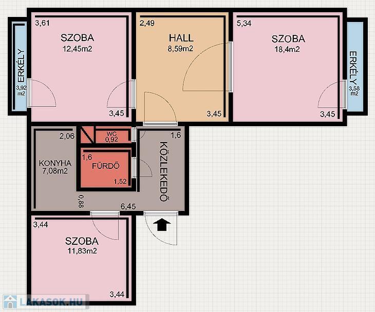 Elosztás: 2 egész szoba + 1 félszoba + tágas hall (étkezőnek vagy nappalinak is ideális)