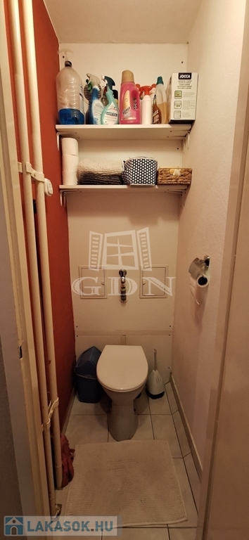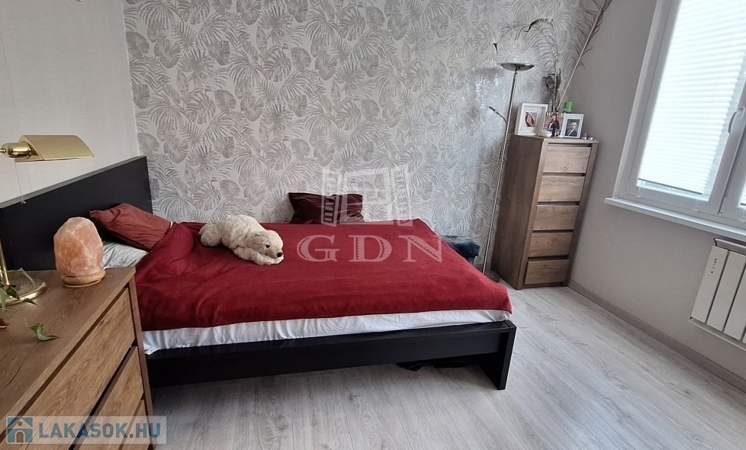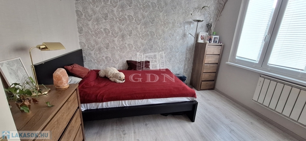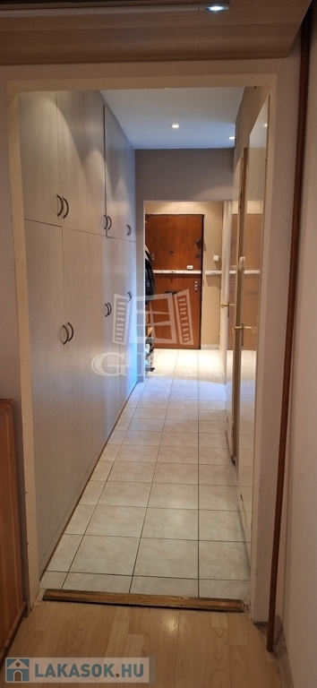 A szobák és a hall laminált parkettával, a többi helyiség járólappal burkolt. A közlekedőben végig beépített gardróbszekrény biztosít elegendő tárolóhelyet.