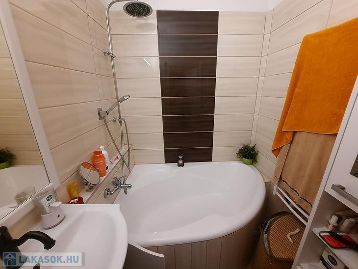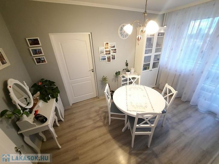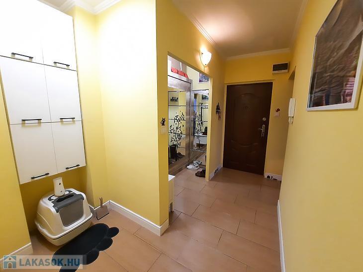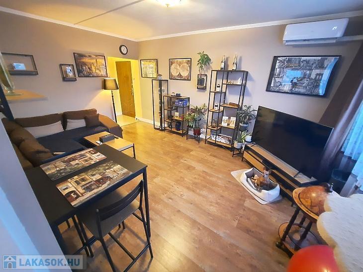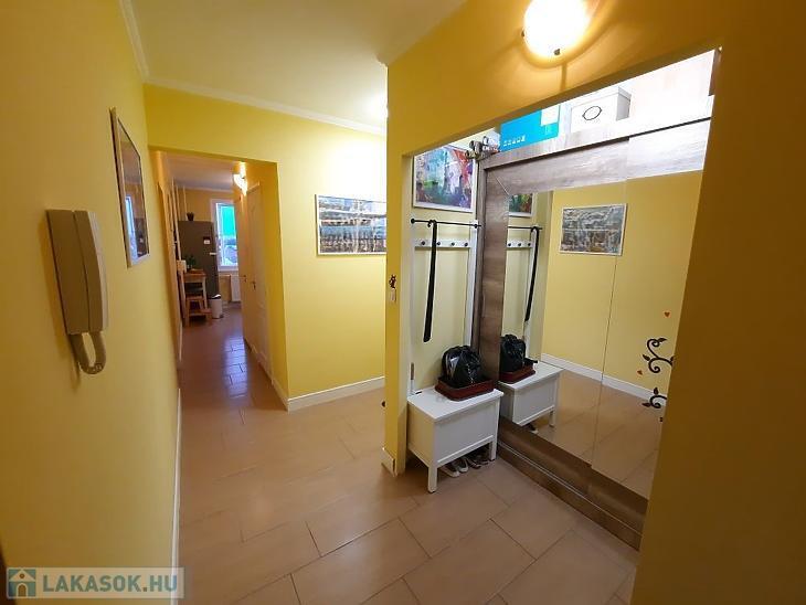 A lakás praktikus elosztású: 2+1 szoba, ablakos konyha, külön fürdő és WC, valamint két tárolóhelyiség a lakáson belül, egy gardrób és egy nyitott spejz . A burkolatok jó állapotúak, a szobákban laminált parketta, a közlekedő és a konyhában pedig járólap található. A lakásban teljes körű villamossági vezeték csere történt. A konyhabútor gépesítve a vételár részét képezi. Egyéb bútorok megbeszélés tárgyai. A bejárati és a belső ajtók cseréje megtörtént. Hűtő-fütő klíma került beszerelésre. Az ablakok régebbiek de lelettek festve.