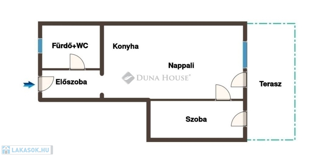 Belépés után az előszobában találjuk magunkat, ahonnan balra a kádas, ablakos fürdőszoba található. A bejárattal szemben a tágas, világos amerikai konyhás nappali helyezkedik el, amelyből eljuthatunk a nagyjából 10 nm-es hálószobába, valamint a teraszra és a saját használatú kertünkbe is.