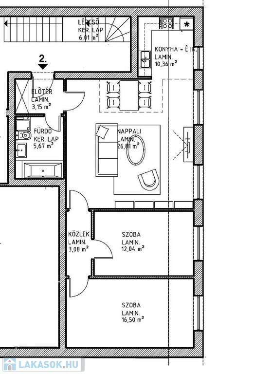 A lakásban tágas amerikai konyhás nappali, 2 szoba, fürdőszoba, előszoba és közlekedő kerül kialakításra.