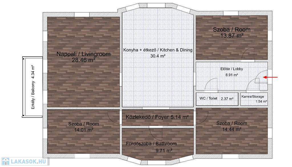 Erkéllyel, tárolóval és 2 fedett parkolóhellyel
