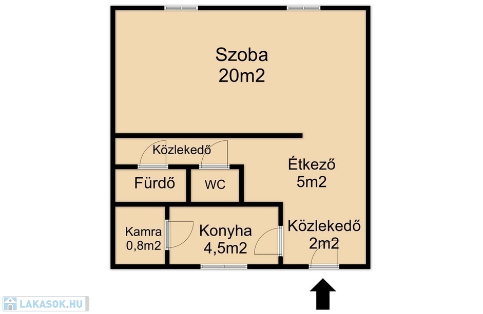 A lakásba belépve egy előszobába érkezünk, onnan balra helyezkedik el az ablakos konyha, amihez egy kamra is tartozik. Az előszobából tovább haladva az étkezőbe érkezünk, onnan balra egy közlekedő nyílik, aminek a jobb oldalán egy beépített gardrób szekrény van és balra nyílik a szeparált mellékhelyiség és a kádas fürdőszoba. Az étkezőből egyenes tovább haladva jutunk el a szobáig, ami az elhelyezkedés miatt nyáron nagyon kellemes hőmérsékletű.