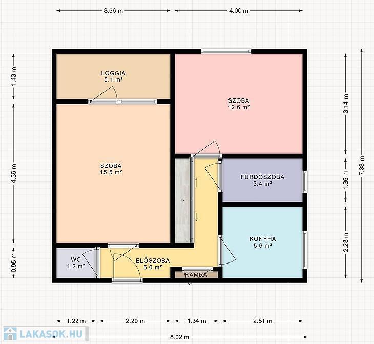 A lakás 52m2-es, tégla építésű, 4nm loggiával.