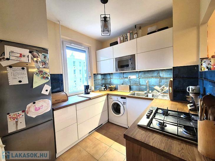 A lakás jó elosztású, világos, a szobákban jó minőségű laminált parketta található a többi helyiség járólappal burkolt. Az otthon melegéről házközponti kazán gondoskodik. A nyílászárók műanyag thermo üvegesek, redőnnyel ellátottak. A beépített bútorok a vételár részét képezik (konyhabútor gépesítve és előszobabútor). A nappaliból csatlakozik az erkély, amely szép kilátást biztosít a Budai hegyekre.