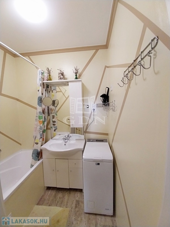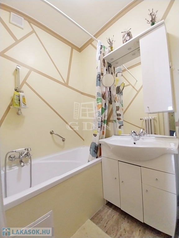 Bal oldalon kapott helyet a külön nyíló tartó szekrénnyel felszerelt 1 nm-es WC, mellette a 3 nm-es kádas újonnan kialakított fürdőszoba.