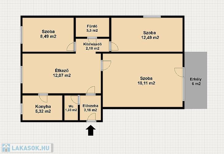 3 szoba, konyha, étkező, kádas fürdőszoba, külön wc, közlekedő, előszoba, erkély