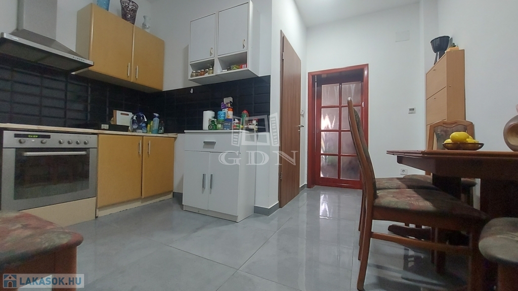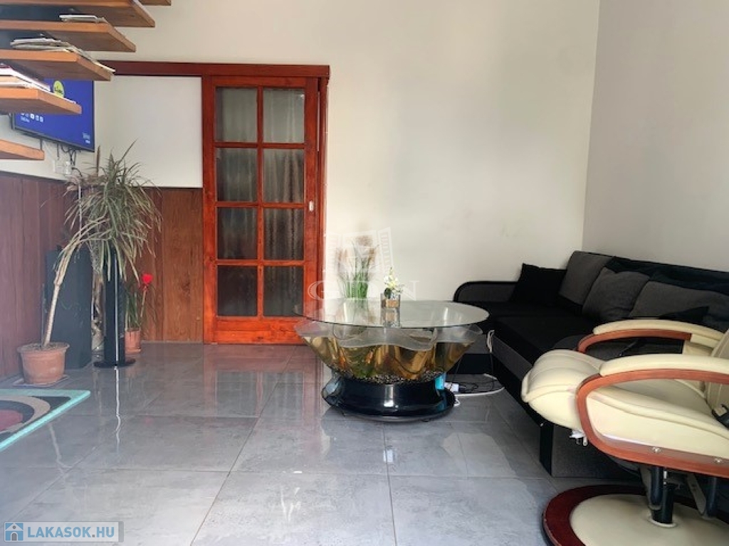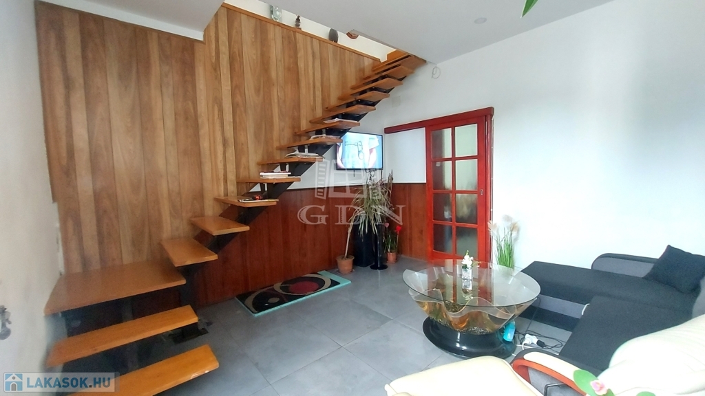 A belső kétszintes lakásba lépve a földszinten, az előszobából, lépcső vezet az emeletre, majd tovább haladva az ebédlős konyhából nyílik a felújított, zuhanyzós fürdő, illetve egy kamra, ahonnan a pincébe juthatunk.Az emeleten, nagy nappaliból nyílik a két szoba és a kádas fürdőszoba.