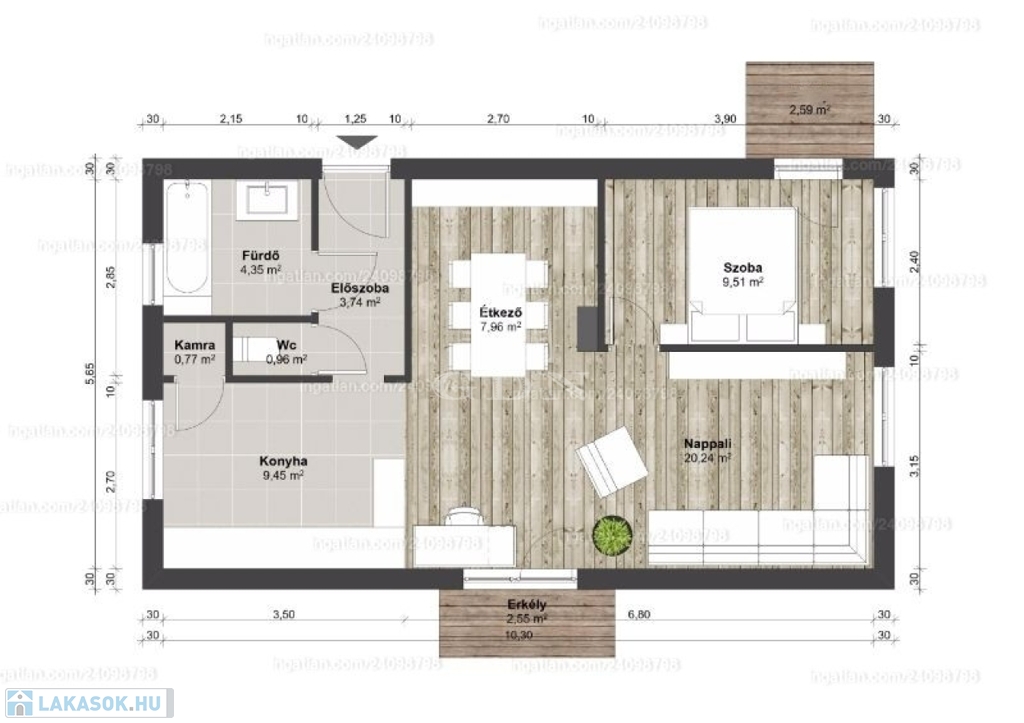 A lakáshoz tartozik egy 3 nm-es erkély is, ami kellemes kinti pihenőhelyként szolgálhat.