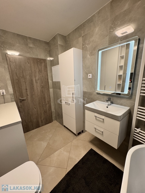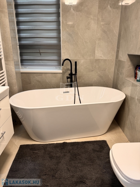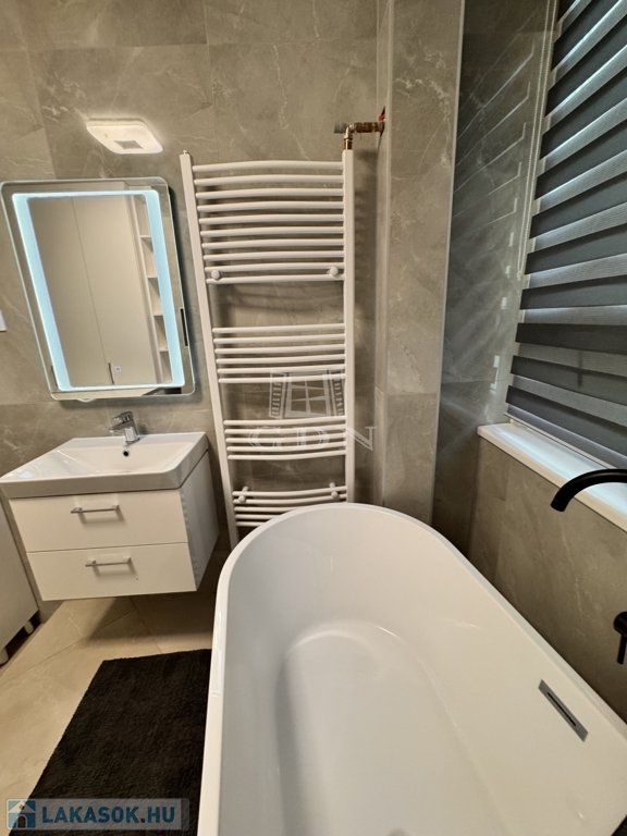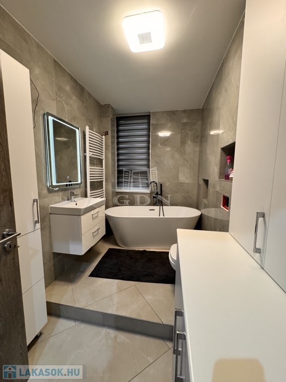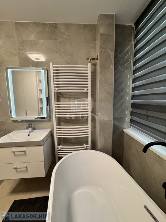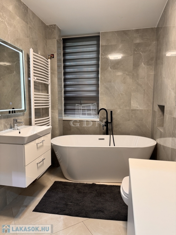 A korábbi konyha helyén egy teljes értékű, modern fürdőszoba kapott helyet, emellett két külön tárolóhelyiség is rendelkezésre áll, ami ritka és rendkívül praktikus.