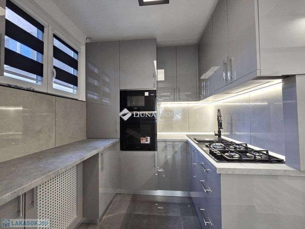 A modern konyha egyedi tervezésű, magasfényű bútorzattal, beépített sütővel, mikróval, gáz főzőlappal és mosogatógéppel felszerelt, így tökéletes választás azok számára, akik szeretik a minőségi, funkcionalitást előtérbe helyező megoldásokat.