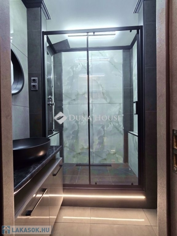 A fürdőszoba igazi különlegesség: épített üvegfalas zuhanyzó, hangulatos LED világítás, elegáns szaniterek és egyedi mosdópult teremtenek luxus hotel hangulatot.