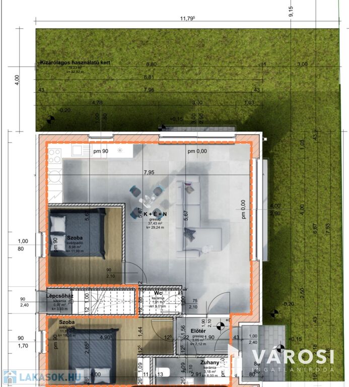 A lakáshoz saját, kizárólagos használatú 80 m2-es kert tartozik, amely ideális pihenésre, családi programokra, vagy akár konyhakert kialakítására is.