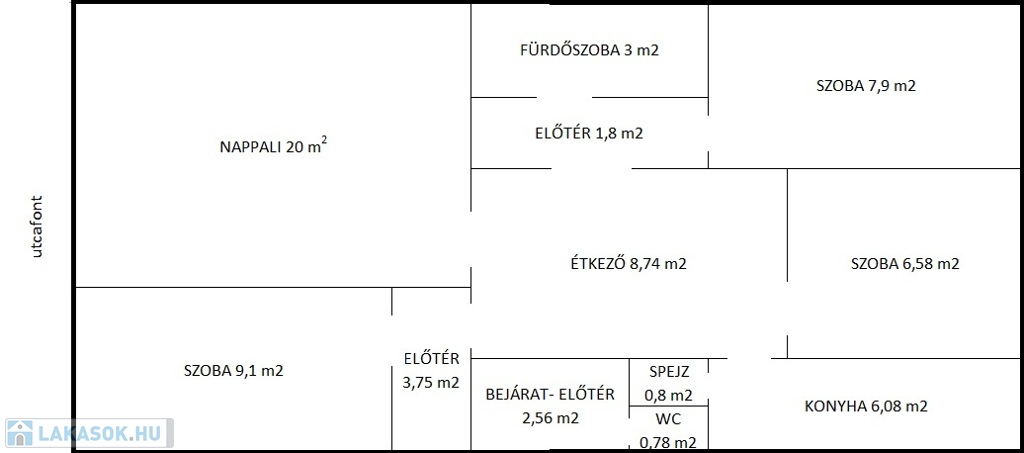 • a konyha, étkező és az egyik szoba összenyitható, így akár egy modern amerikai konyhás nappali–étkező is kialakítható