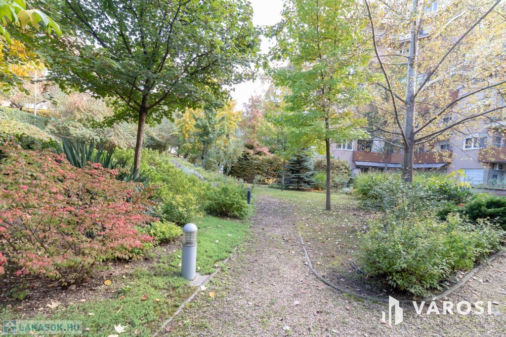A kertvárosi jelleget a társasház hatalmas, több szintes, zárt, szépen parkosított udvara adja, ahol sétányok, padok és játszótér is várja a lakókat.