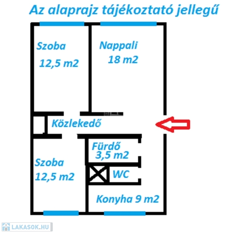 BEOSZTÁS: a tágas előszobából nyílik a nappali és 2 egész szoba, balra fürdőszoba, WC, konyha.