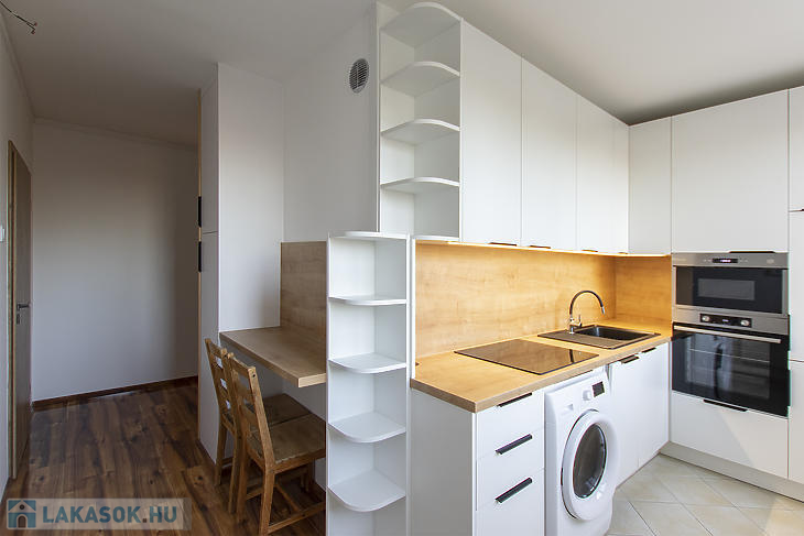 A konyha praktikus kialakítású, beépített sütővel, főzőlappal és mosogatógéppel felszerelt, így minden adott a kényelmes főzéshez. A fehér szekrények és a fa hatású munkalapok harmonikus, letisztult hangulatot teremtenek. A konyha mellett egy kis étkezőrész is kialakításra került, amely ideális egy gyors reggelihez vagy egy kellemes vacsorához.
