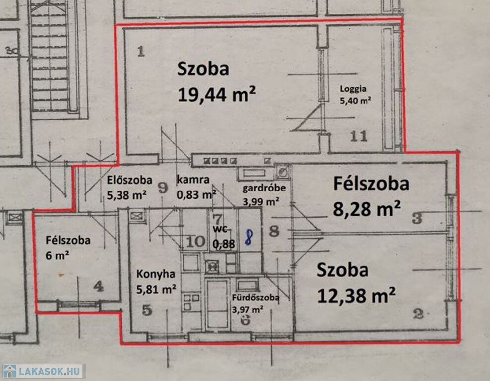 A lakás elrendezése praktikus: 2 szoba + 2 félszoba, konyha, kamra, előszoba, külön WC, fürdőszoba, gardrób és 5,40 m² loggia tartozik hozzá. A helyiségek világosak, jó természetes megvilágítással rendelkeznek. A konyha, az egyik félszoba és a fürdőszoba délre néz, míg a többi helyiség keleti tájolású. A fűtést gázcirkó biztosítja, a melegvíz-ellátás villanybojlerrel történik. A szobák parkettaburkolatúak, a többi helyiség mettlachi burkolattal ellátott. A lakás műszaki állapota közepes, ugyanakkor megkímélt állapotú, nem lelakott, jelenleg egy tisztasági festés után is lakható. A nyílászárók eredeti Teassauer típusú ablakok, amelyek korszerűsítése a jövőben indokolt lehet. A lakáshoz saját pincerész is tartozik, valamint a társasházban babakocsitároló is rendelkezésre áll.