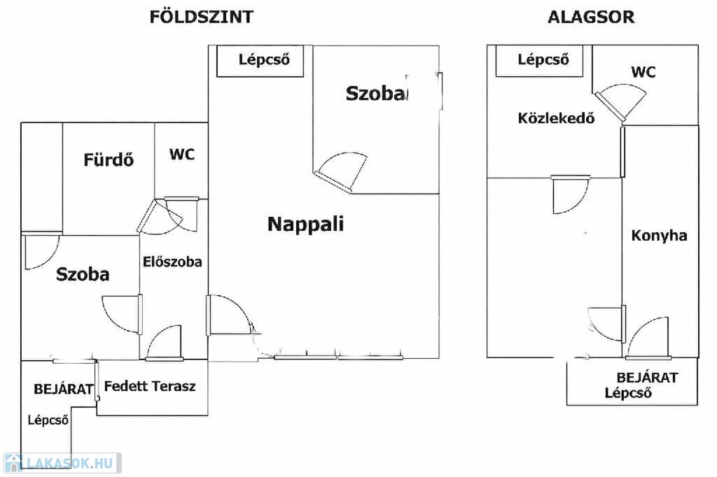 Az alsó szinten egy szoba vagy étkező, konyha, WC, valamint közvetlen kijárat a kertbe.