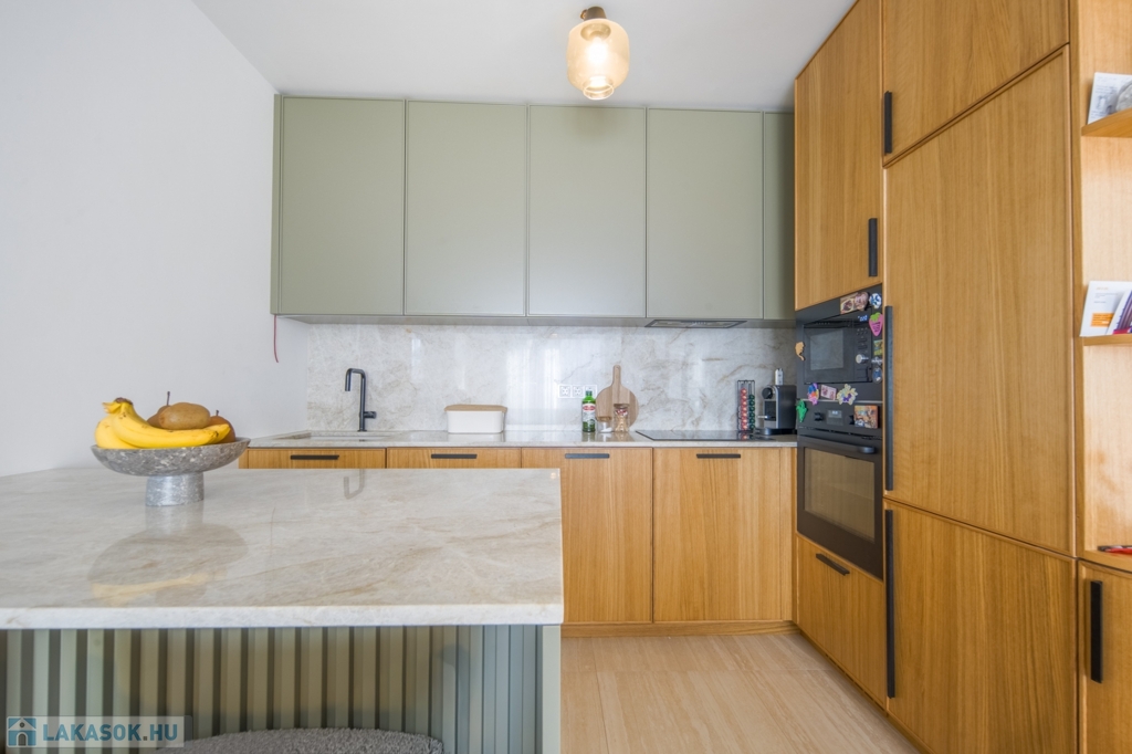 A 7 m2-es fürdőszoba kádas, ablakos, a WC-vel egy helyiségben, a konyhabútor teljesen egyedi építésű, beépített gépekkel együtt az ár részét képezi.