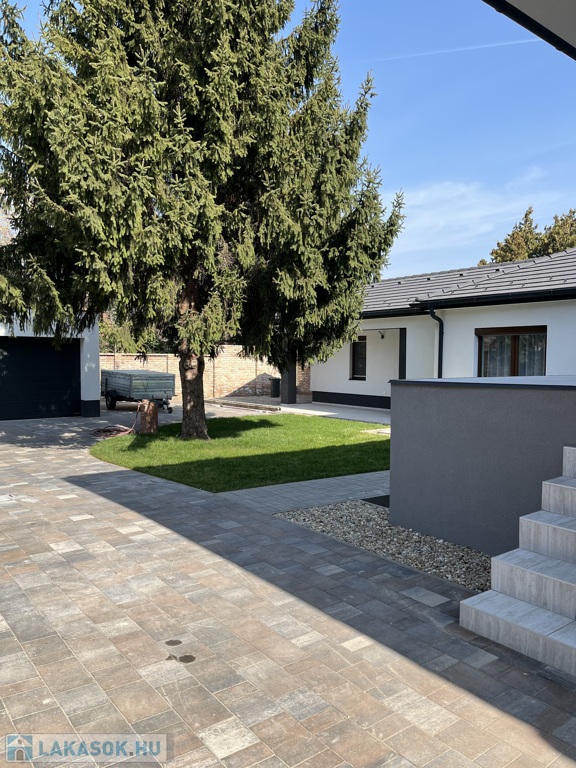 térkövezett udvar, gondozott zöldfelület