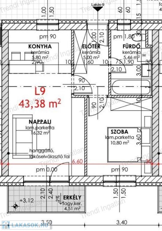 A meghirdetett 1. emeleten található 43,38 nm-es ingatlanban amerikai konyhás nappali, szoba, fürdőszoba, előtér kerül kialakításra. A nappaliból 4,51 nm-es erkély nyílik.