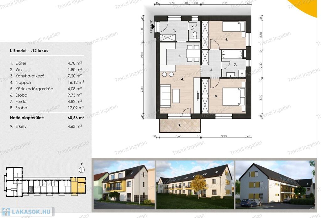 A meghirdetett 1. emeleten található 60,56 nm-es ingatlanban amerikai konyhás nappali, 2 szoba, fürdőszoba, külön WC, gardrób, előtér kerül kialakításra. A nappaliból 4,64 nm-es erkély nyílik.