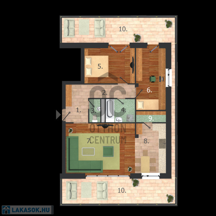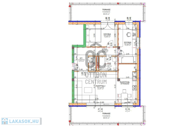 --két 20 nm-es terasz, a K-i fekvésű a nappaliból, a Ny-i a két hálószobából nyílik