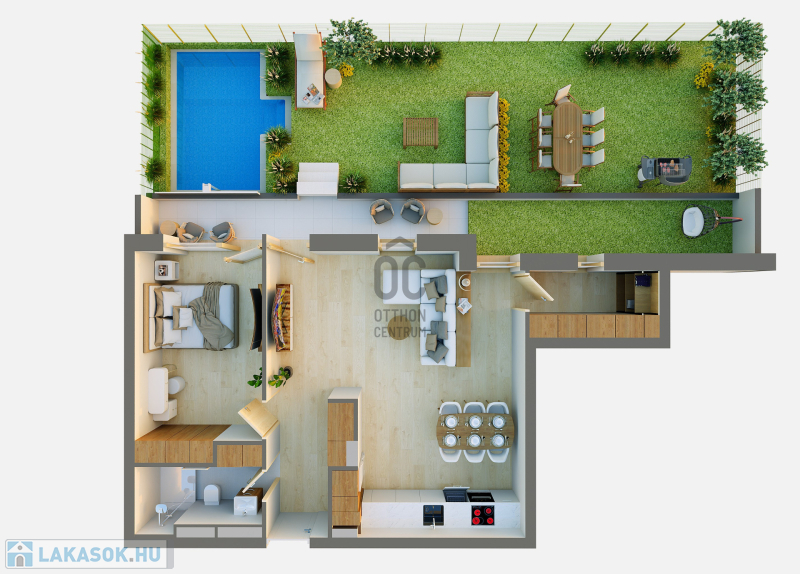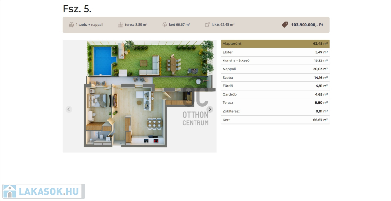 Ez a földszinti kertkapcsolatos lakás 62,45 nm-es, nappali-étkező-konyha +1 szobás, 8,8 nm-es terasszal és 67 nm-es kerttel.