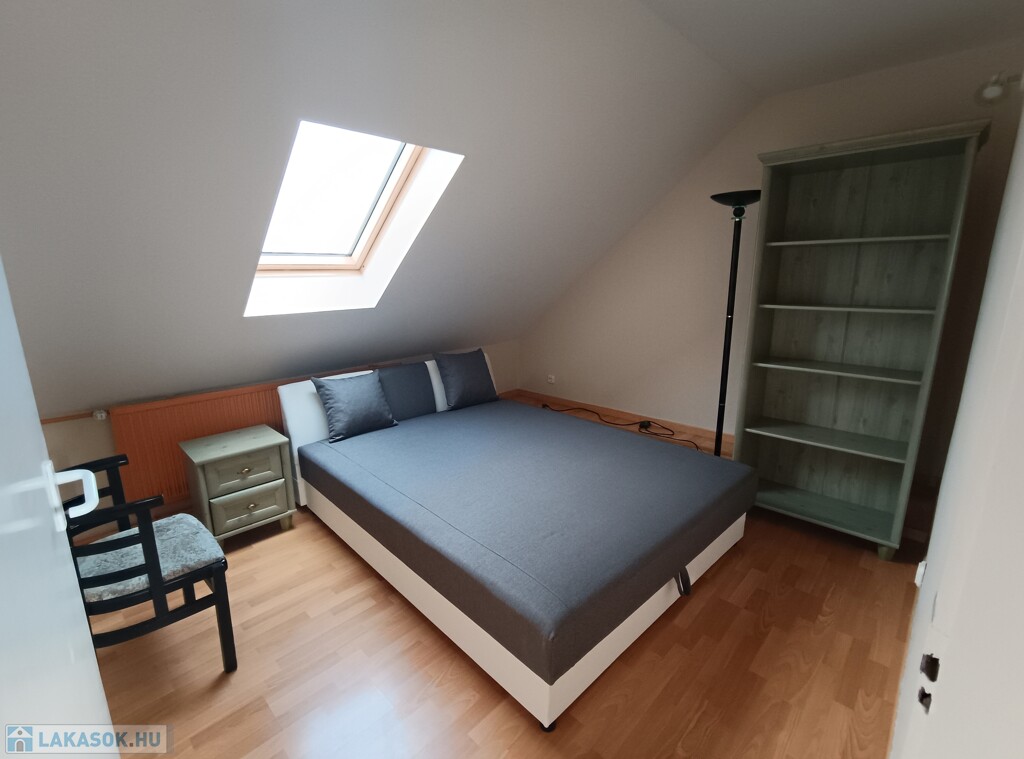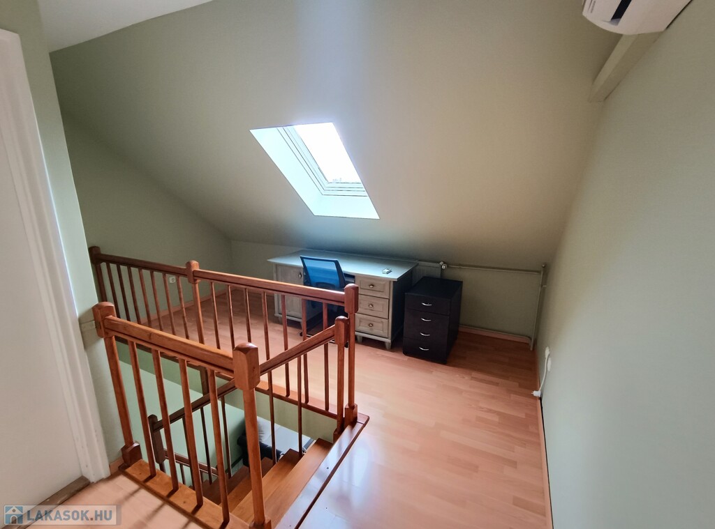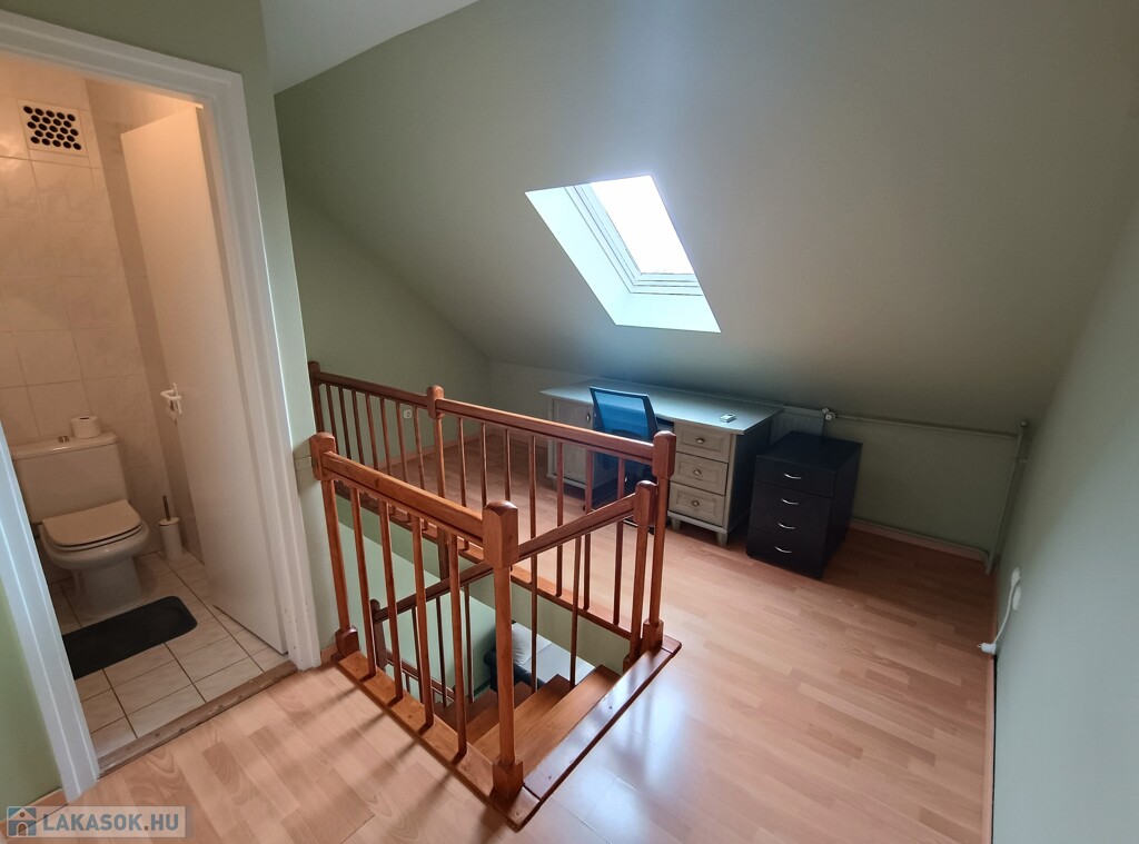 - Felső szint, (tetőtér) helyiségei: előtér, két hálószoba, WC kismosdóval.