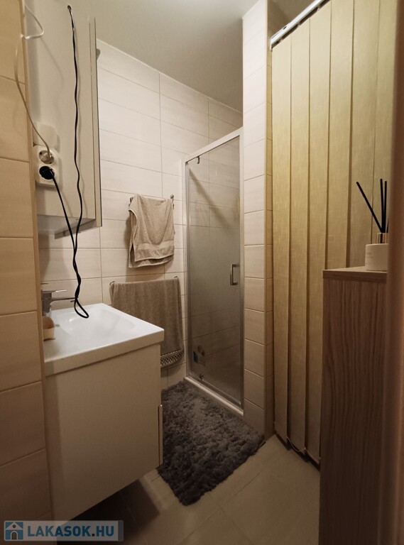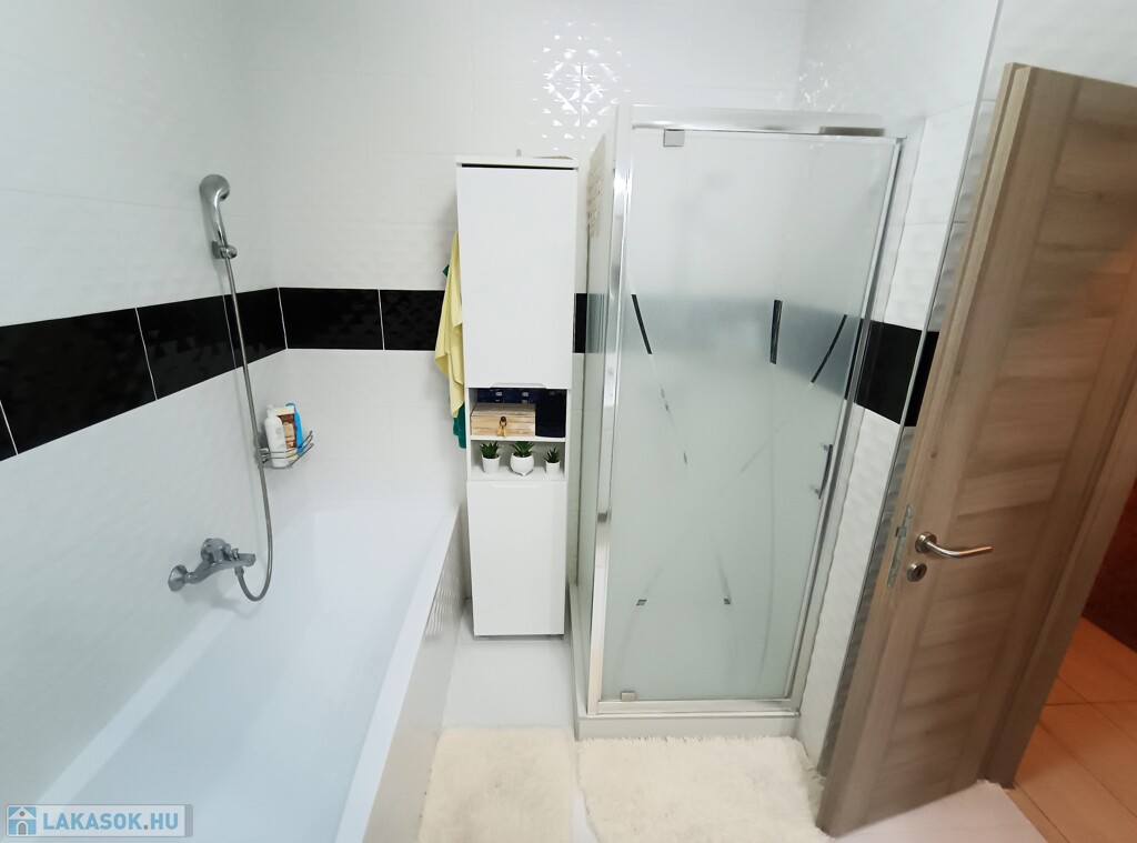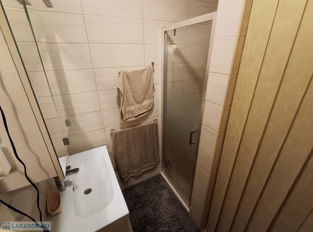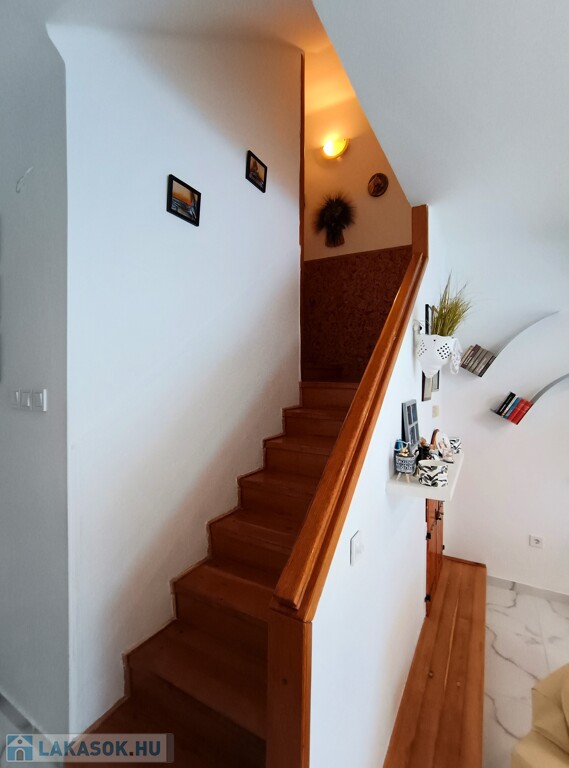 - Alsó szint helyiségei: előszoba, konyha, étkező és nappali egyben, zuhanykabinos fürdőszoba + WC. Az előszobában igényes beépített szekrények találhatók.