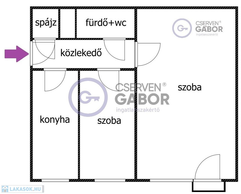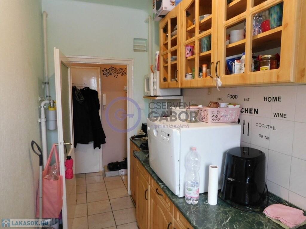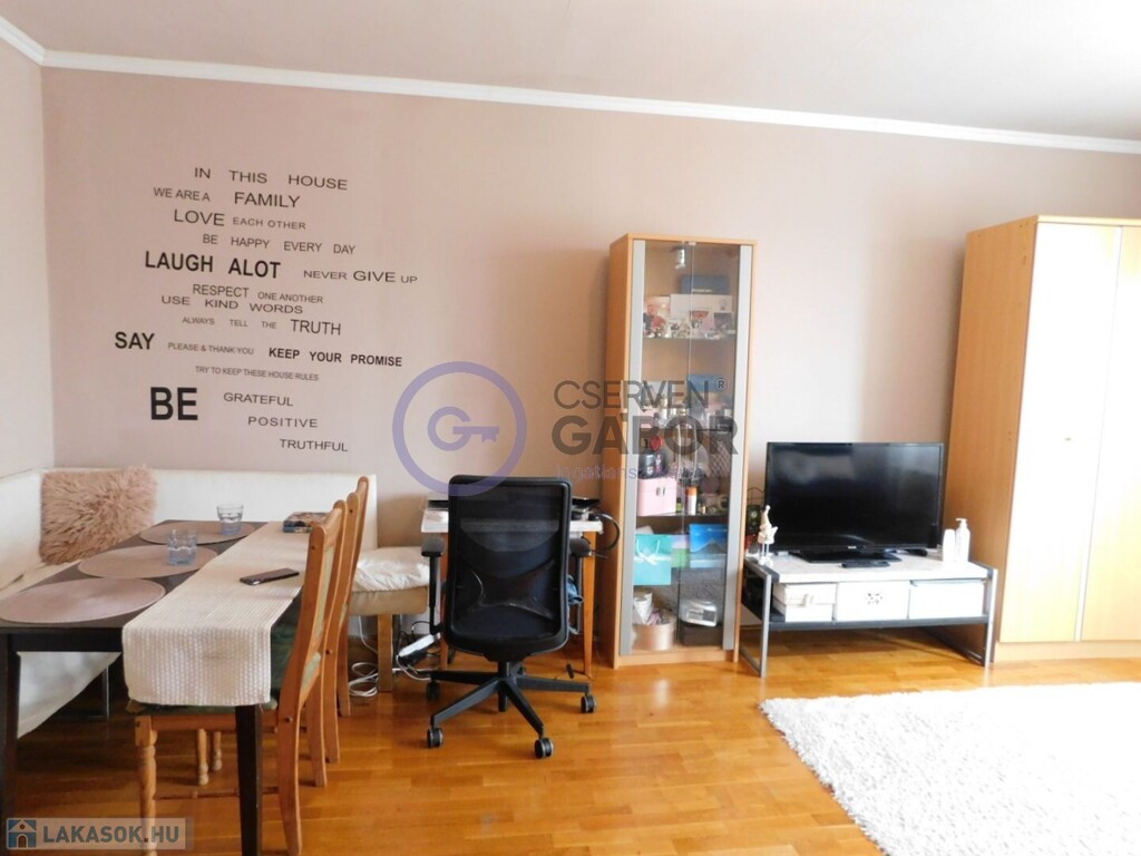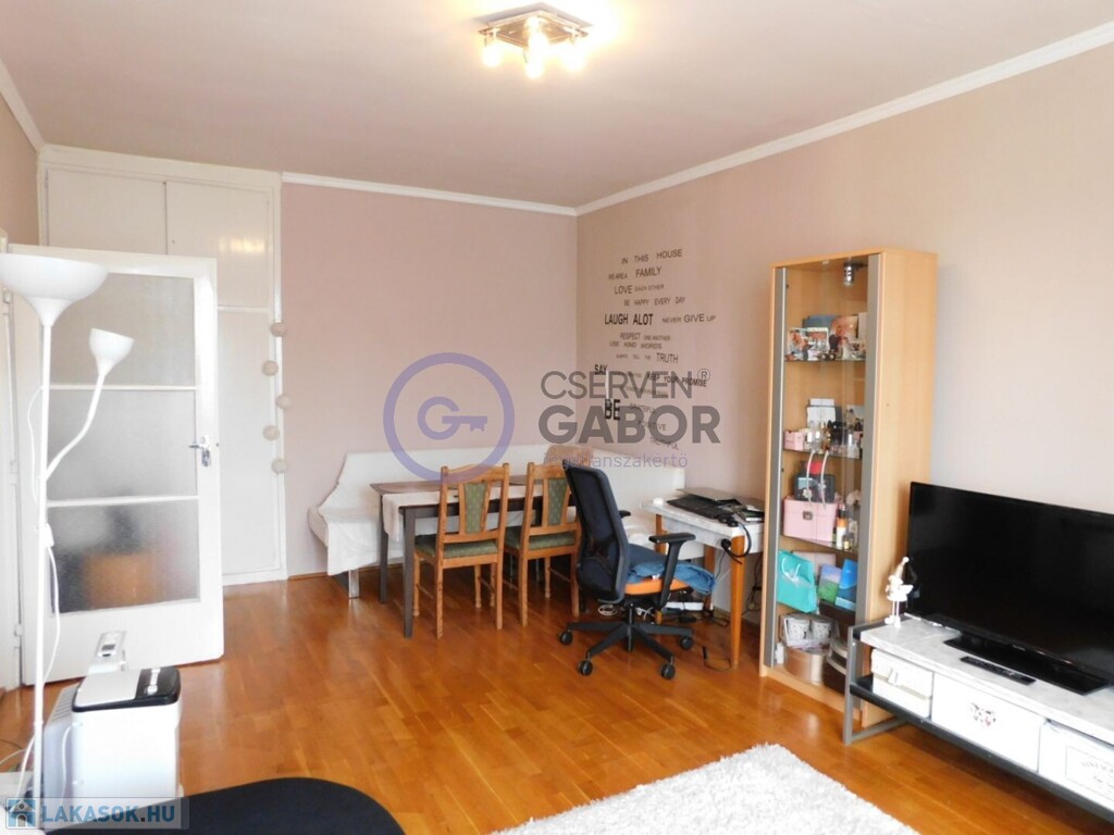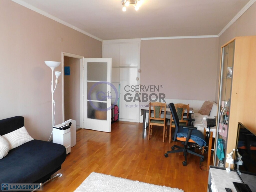 Az ingatlan 43 m2-es lakóterülettel rendelkezik, ami magába foglal egy kimondottan tágas nagyszobát, egy külön bejáratú, cirka 6m2-es félszobát, vele szemközt a fürdőt, ami együtt van a WC-vel, továbbá a bejárattól balra a konyhát és jobbra a spájzot.