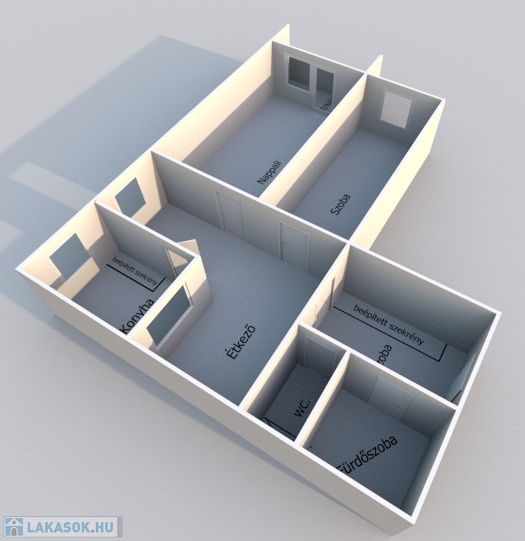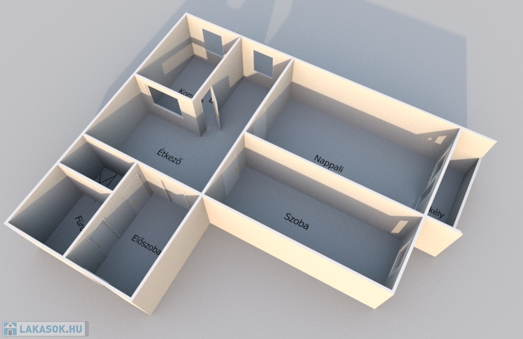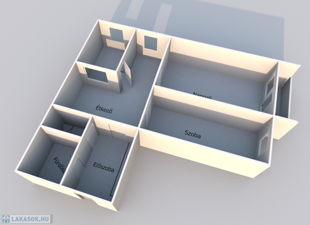 - Helyiségei: előszoba, konyha + étkező, 2 külön nyíló szoba, fürdőszoba, WC külön.