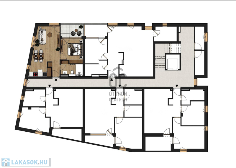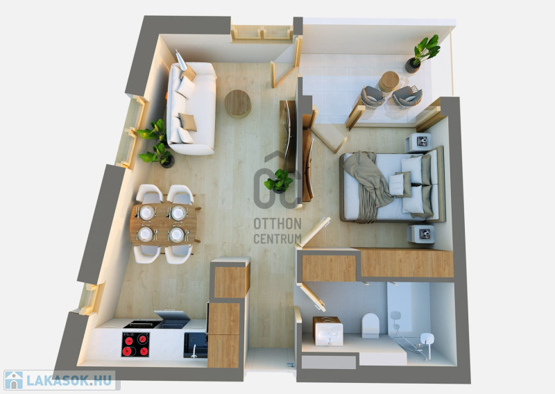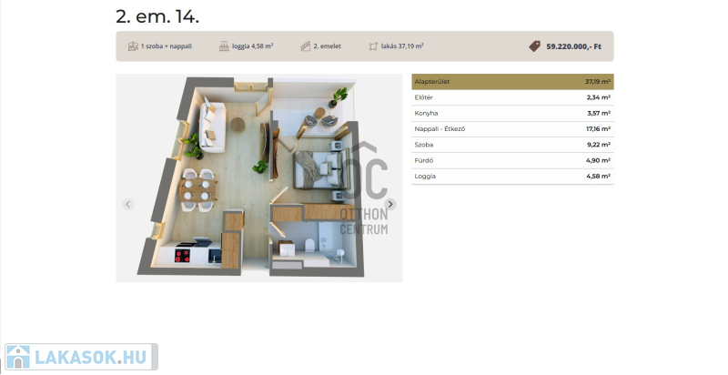 Ez a 2.emeleti lakás 37,19 nm-es, nappali-étkező-konyha +1 szobás, 4,58 nm-es loggiával.