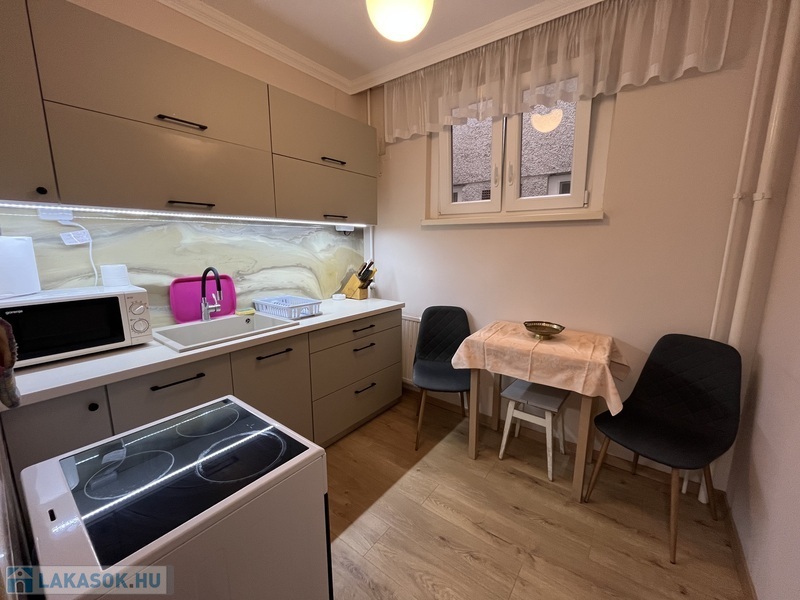 Teljes körûen felújított, bútorozott otthon az Újkert szívében Akár garázzsal! Debrecen egyik legkedveltebb és legélhetõbb városrészében, az Újkertben eladóvá vált egy kiváló adottságokkal rendelkezõ, 53 nm-es, 2 különnyíló szobás, erkélyes lakás. Az ingatlan teljes körû felújításon esett át, így Önnek már semmilyen munkálattal nem kell foglalkoznia. A lakás teljes bútorzattal együtt kerül értékesítésre, így valóban csak a bõröndjét kell hoznia! Miért érdemes ezt választania? Kiváló elrendezés: Két különnyíló szoba, ideális pároknak, kisebb családoknak vagy befektetésnek. Teljes körûen felújított: Modern, igényes belsõ tér, azonnal költözhetõ állapot. Bútorozott: A vételár tartalmazza a berendezési tárgyakat, így idõt és költséget spórol. Erkély: Hangulatos saját külsõ tér a reggeli kávézáshoz. Parkolás: Az utcán a parkolás ingyenes, de igény esetén saját garázs is vásárolható hozzá 12,9 millió forintért. Kiváló lokáció: A környék infrastruktúrája tökéletes: a közelben minden megtalálható, ami a mindennapokhoz szükséges: Boltok, szupermarketek Orvosi rendelõ, gyógyszertár Posta Kiváló tömegközlekedési kapcsolatok Az ingatlan rugalmasan megtekinthetõ, tehermentes és azonnal birtokba vehetõ! Amennyiben felkeltette érdeklõdését ez a remek lehetõség, várom hívását.
