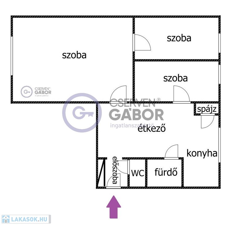 A lakótér elrendezése abszolút praktikus. A központi teret az étkező alkotja, mivel az előszobából ide érkezünk, és a többi helyiség is innen nyílik. A nagyszoba kiválóan alkalmas lehet egy tágas nappalinak, a félszobák hálószobának és gyerekszobának. A konyha szervesen kapcsolódik az étkezőhöz, és még egy spájz is tarozik hozzá. A fürdő kényelmes méretű, és a WC külön helyiségben kapott helyet.