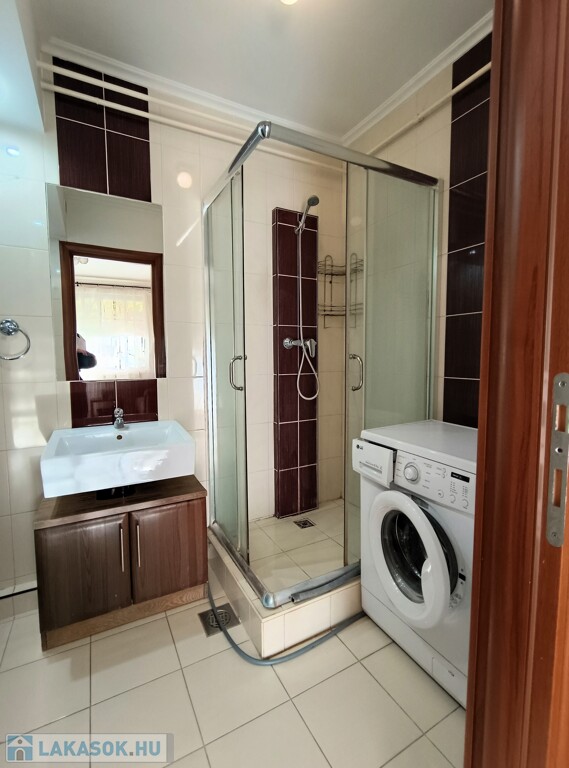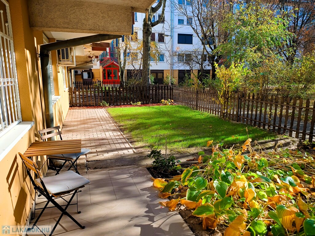 Kert: 70 m², két terasszal (15 m² térkövezett, 13 m² fagyálló burkolatú), valamint füvesített rész.